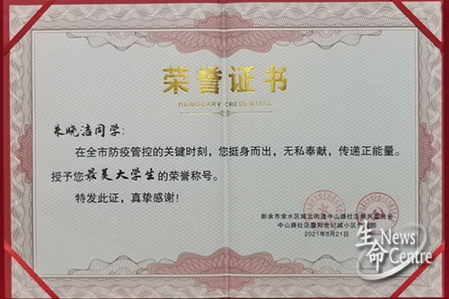 在暑期疫情卷土重来之际,为响应当地防疫号召,朱晓洁同学主动走上抗疫一线,担任社区防疫工作志愿者,十几天如一日地对外来人员进行必要的信息登记、查验健康码和行程码、测量体温等,同时向当地居民宣传疫情防控知识。朱晓洁同学在烈日暴晒和风吹雨打的恶劣天气下,没有任何怨言,仍然连续数天坚守岗位,冲锋在疫情防控一线。在工作中,面对部分居民的不理解不配合,她耐心地科普、劝说和引导,未曾有半句抱怨。正如表扬信中所说:“她用实际行动抗击疫情,树立了青年先锋模范形象,彰显了新时代大学生的青春责任和担当,用行动践行‘请党放心,强国有我’的铮铮誓言。”